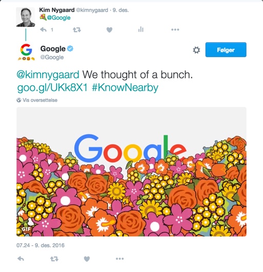 Forsøk selv: Twitre en blomst-emoji til @google så får du tilbake en lenke med informasjon om nærmeste blomsterbutikk.